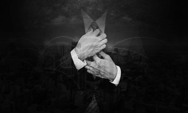 Zakenman met een wereldstad op de achtergrond in verschillende materialen